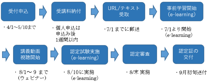 - 講習会終了後、認定試験(e-learning)を2026年8月10日の決められた時間に行います。認定試験は40分間で、テキスト参照可です。また、資格認定基準は各々60点以上で再試験はございません。(事前学習の実施が条件)